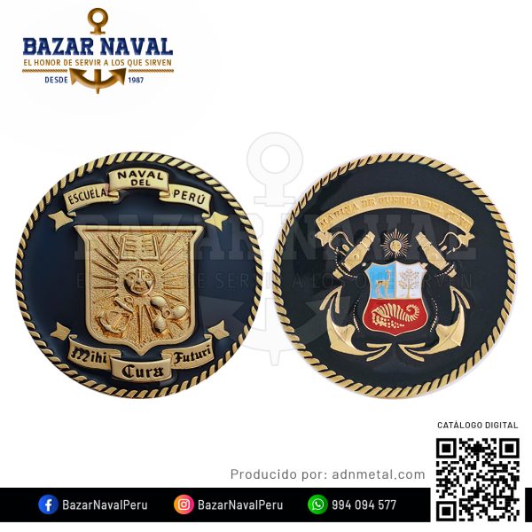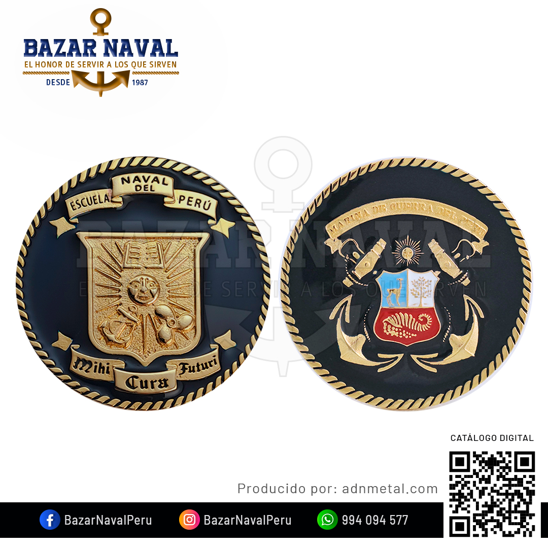Un tributo metálico de doble cara que refleja el alma y la misión de quienes sirven en el mar. La moneda institucional Alma Naval presenta por un lado el escudo de la Marina de Guerra del Perú y, por el otro, el emblema de la Escuela Naval del Perú, alma mater de los cadetes que se forjan como futuros oficiales. Su lema «Mihi Cura Futuri» —nosotros forjamos el futuro— vibra como promesa grabada en alto relieve.